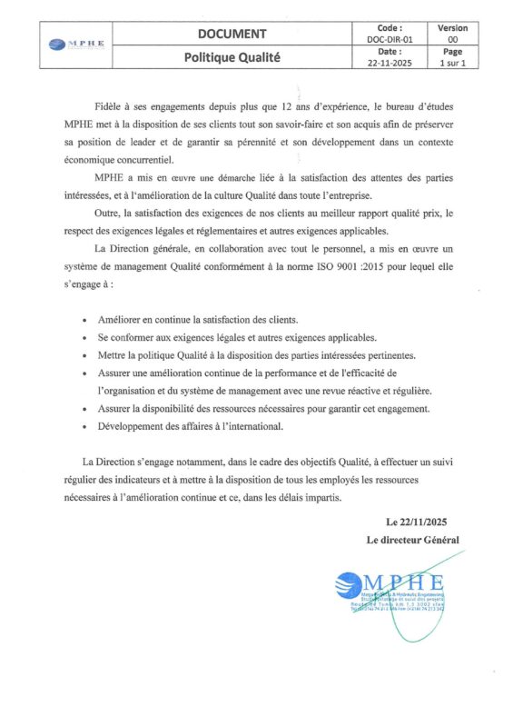 Mega Projects and Hydraulic Engineering « MPHE » est un bureau d’études Tunisien, pluridisciplinaire agréé par le ministère de l’équipement, de l’aménagement du territoire et du développement durable.